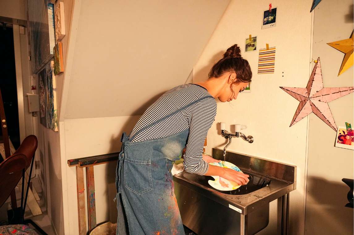 パレットや絵筆をザザッと洗って