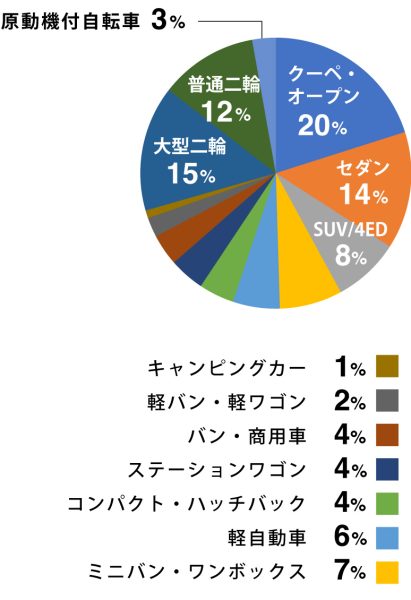 車のタイプとしては、クーペ/オープンがトップに。ツードアでスポーツカーに多いクーペや、ルーフを開けて楽しむオープンカーは、日常使いよりは、セカンドカーとして所有する人も多い車種。輸入車などの高級車に多くみられるのも特徴です。