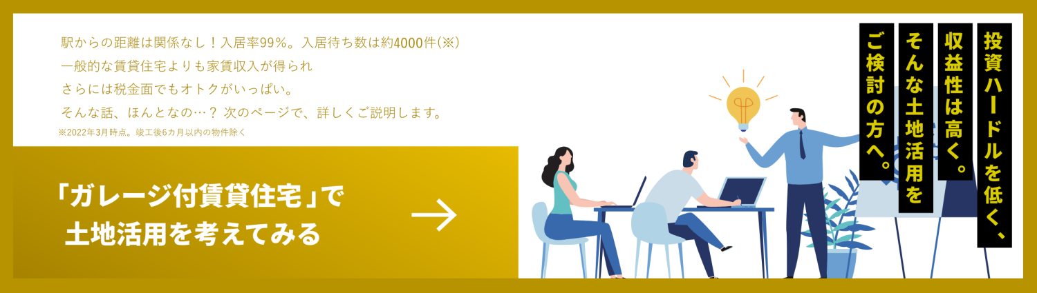 | アパート・マンション経営に比べても、多くの節税メリットを享受できる可能性の高い賃貸ガレージハウス経営。土地活用を検討されている方は選択肢の1つとして検討してみてはいかがでしょうか。 | ![]() |