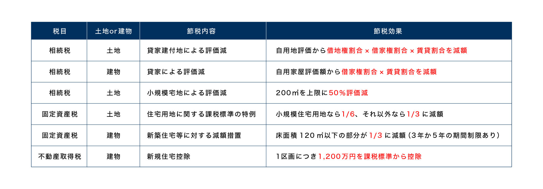 賃貸ガレージハウス経営、賃貸アパート・マンション経営など「土地の上に建物を建て、第三者に賃貸する土地活用」を行うことで節税できる税金の種類には、大きく「相続税」「固定資産税」「不動産取得税」があり、それぞれ適用されるための条件があります。それぞれの税金の内容と、節税のポイントについて紐解いてみましょう。
