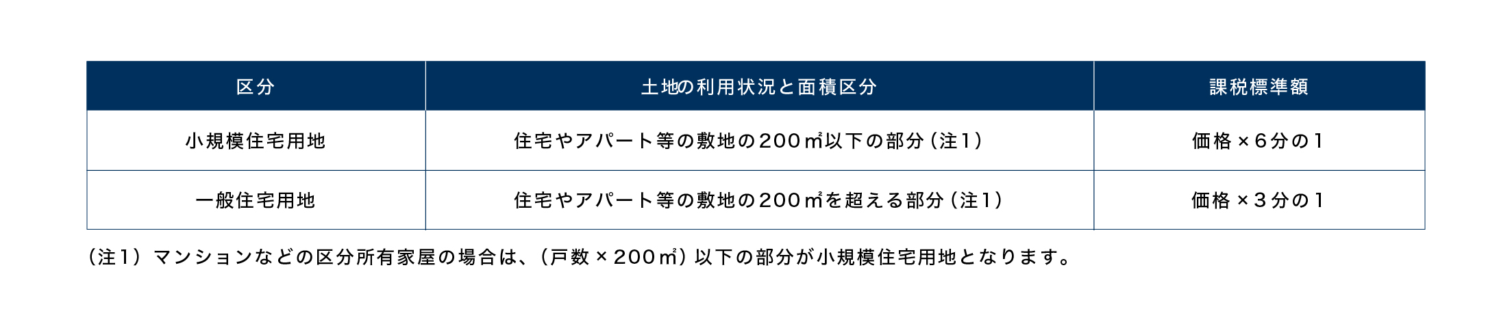 住居部分が1/2以上であれば建物用途が住宅扱いとなるため「住宅用地の軽減措置」が適用され、小規模住宅用地なら1/6、小規模住宅用地以外は1/3に減額。
