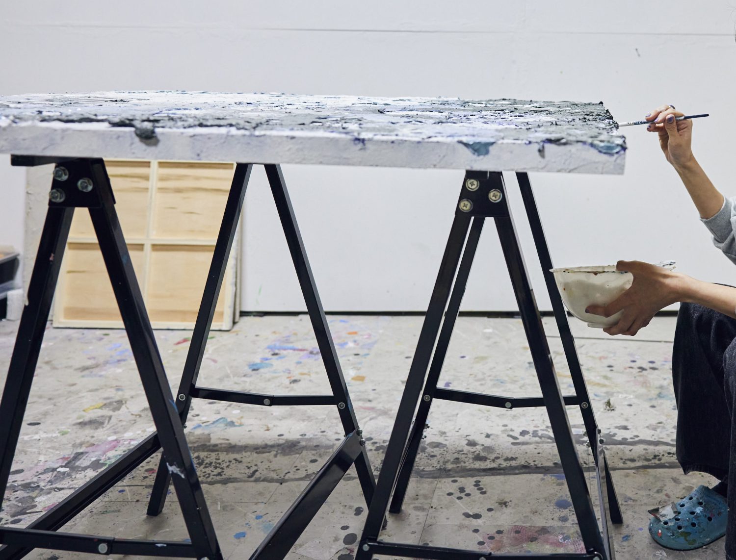 シャッターを開けると、そこに広がるのはアートの世界―。独創的な現代アート作品が飾られ、棚には色とりどりのアクリル絵具やたくさんの画材が。雑然と置かれた筆や絵の具皿、床に飛び跳ねた絵具でさえインテリアの一部と化した、味わい深いアトリエ空間が現れます。