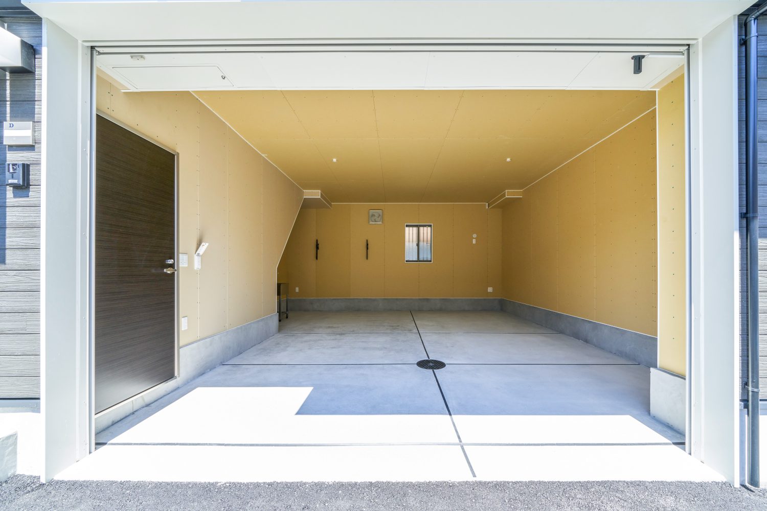 2台の車を出し入れしやすいよう、ガレージの開口部には、幅芯々約5.0メートルの壁に幅約4.5メートルの大開口シャッターを設置。入口を最大限まで拡げたそうです。