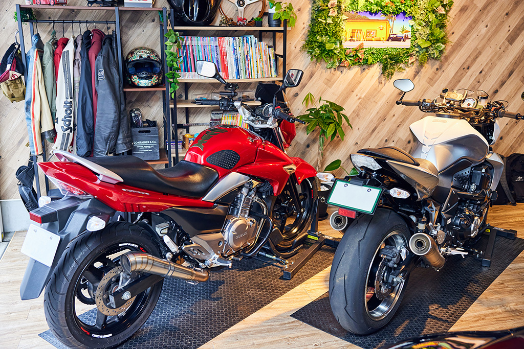 黒く眩い光を放つBMW Z3、その横にはKAWASAKIのスーパーネイキッドバイクZ1000が堂々と鎮座する、車・バイク好きにはたまらない光景が広がるガレージ。男の趣味空間を体現しながらも、壁面の装飾やインテリアの造り込みなどからは洗練された雰囲気が漂います。