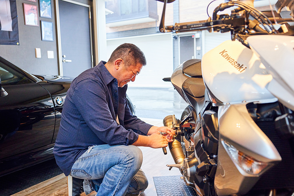 「夏の炎天下では作業ができないので、運動会で使うようなテントを張って整備していました。プレミアムガレージハウスでは、シャッターを閉めてエアコンを入れれば快適だし、天候も気にしなくていい。たとえば、ツーリングの誘いがあれば、前日の夜にチューニングや準備ができるなど、いつでも好きな時間に作業ができるのはすごくいいですね。ガレージが広く、奥行きもあるので余裕を持って作業できますし、開口部が大きいので車・バイクの出し入れがしやすいのも嬉しいです」