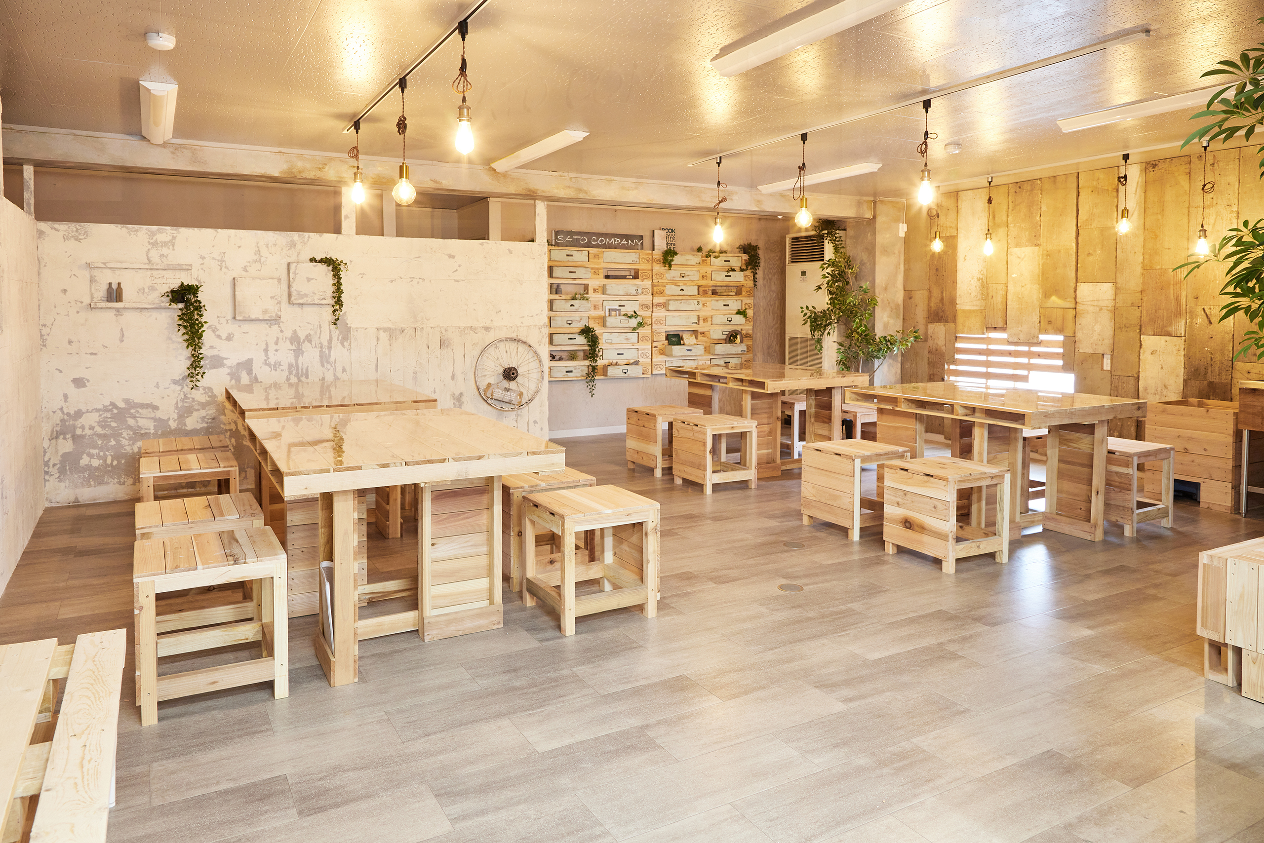 浦和工場2階のショールームへ行くと、パレットの形状や素材感を活かしたさまざまなDIYを見ることができます。