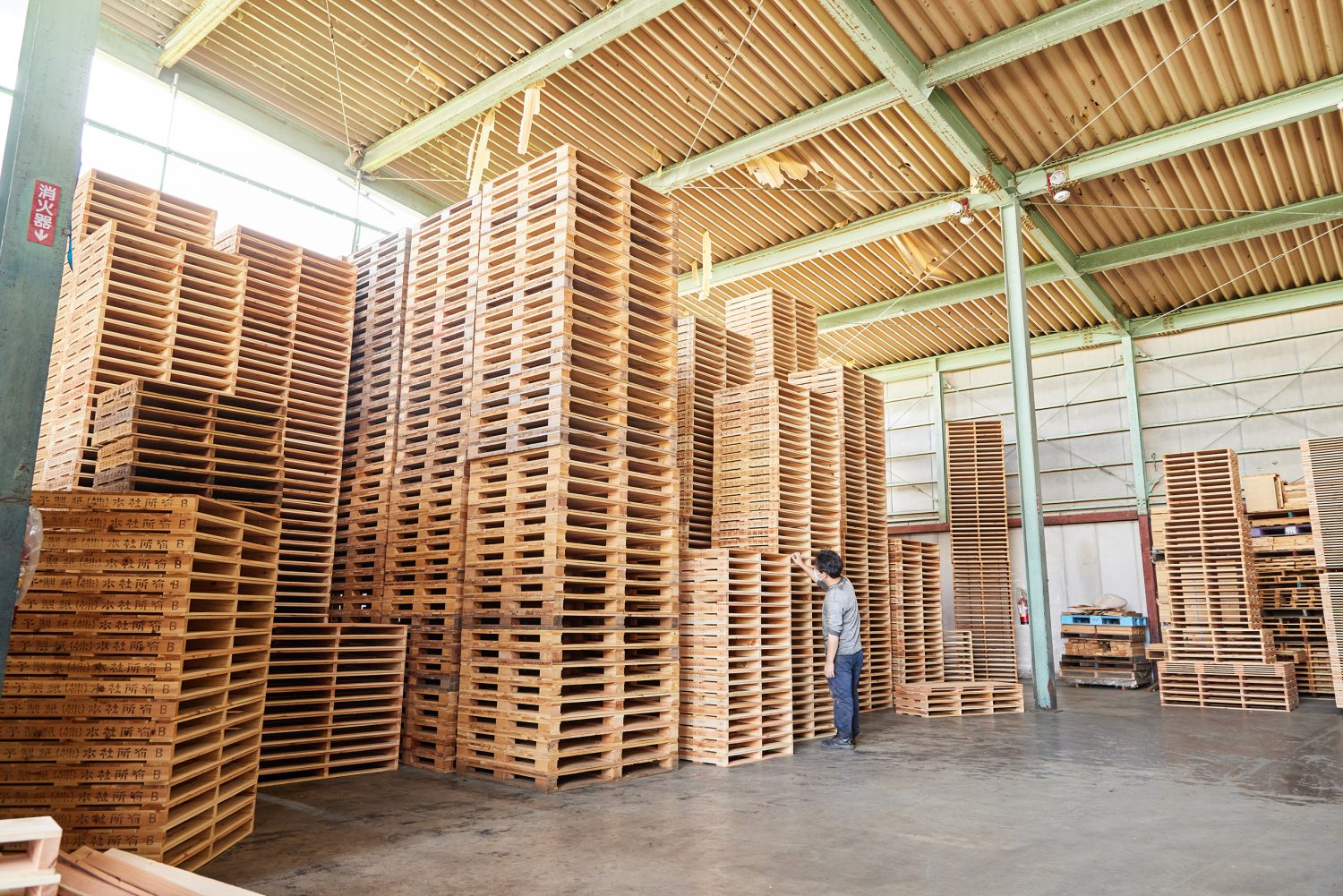 同一のサイズで作られたパレットだからこそ、タテにもヨコにも並べて使いやすいという特徴も。また強度があるため、積み重ねても大丈夫。耐荷重は、12mm板厚のパレットで500キロほど。15mm板厚のパレットでなんと1000キロの重みに耐えられるそうです。