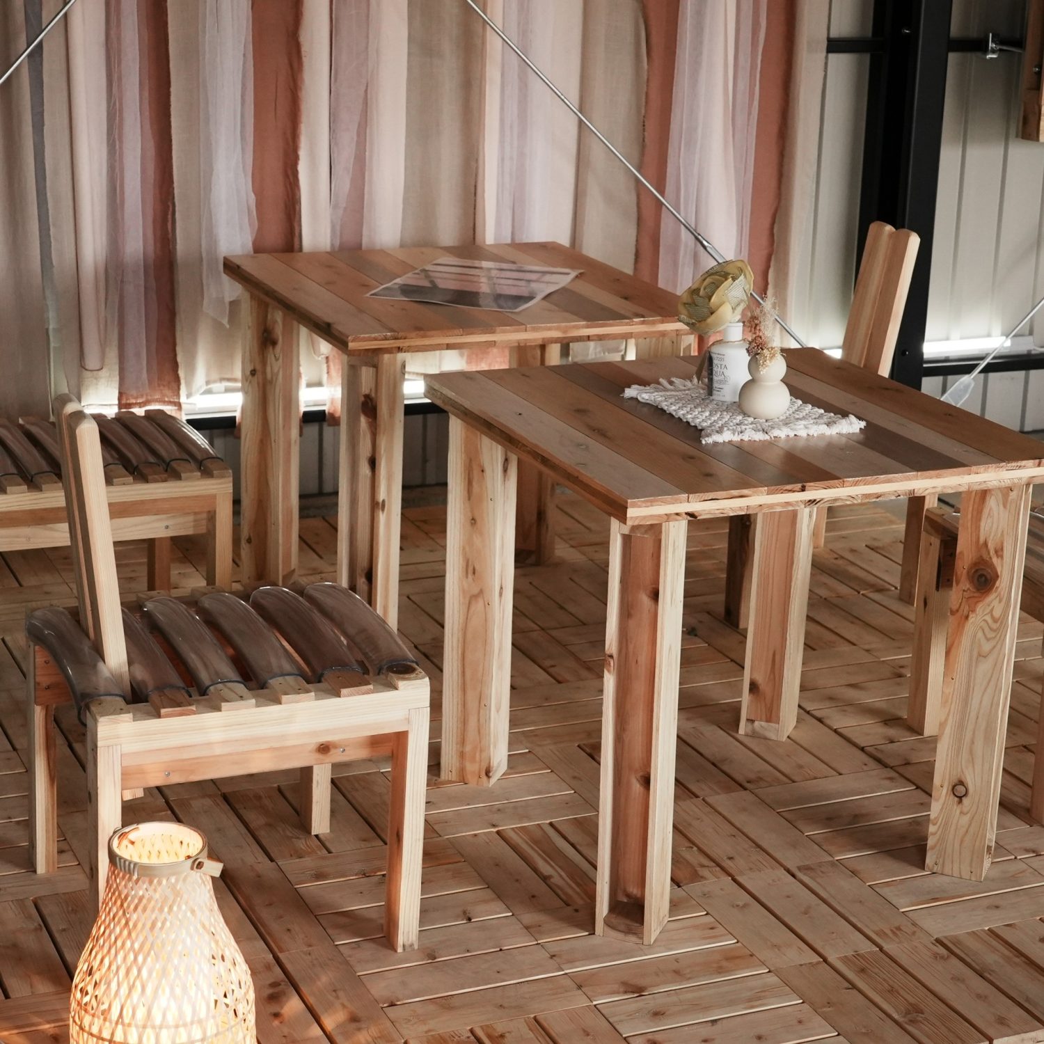 アイデア次第で、テーブルや椅子、棚など無限に応用できるパレット。マルパのオンラインストアでは、届いたパーツを自分で組み立てるだけで完成するパッケージ商品も販売しています。