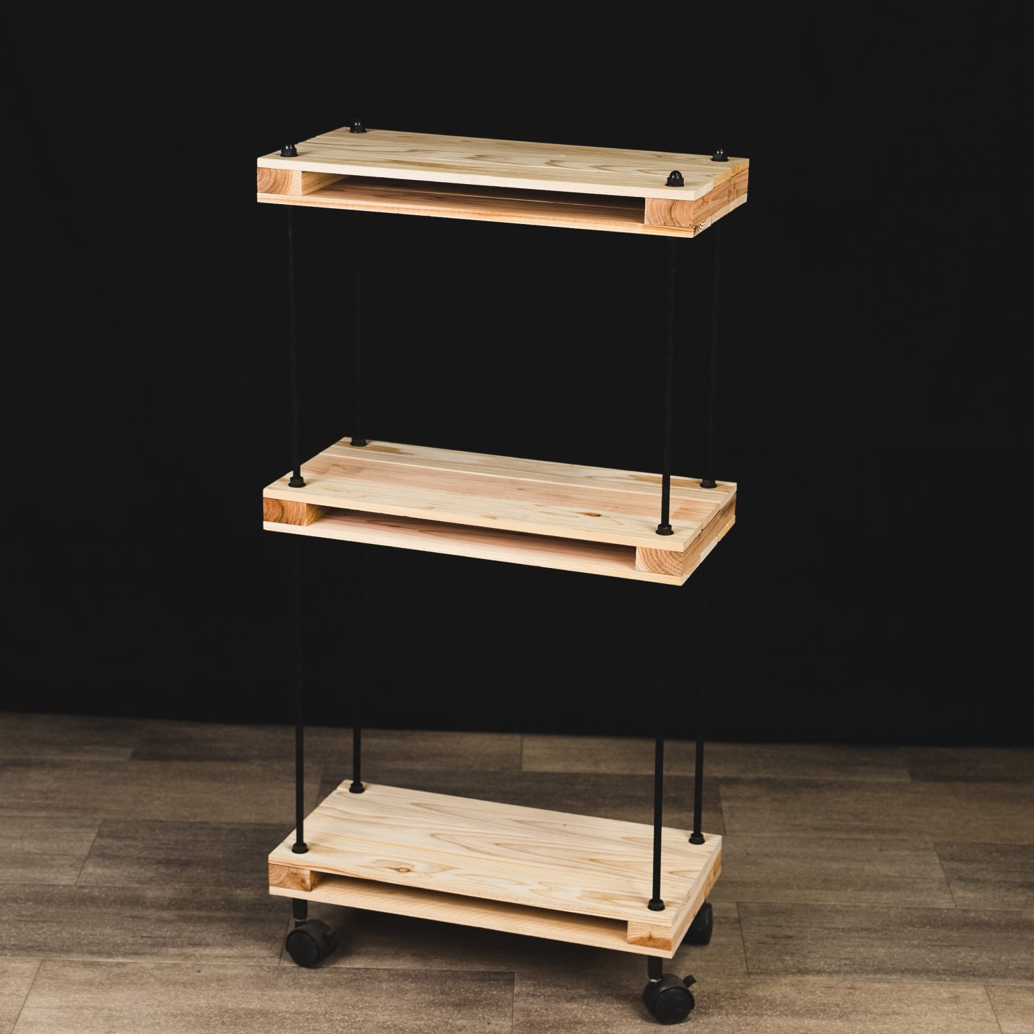 アイアンパーツがガレージの空間にもぴったり。キャスター付きで取り回しが良いので、作業時の一時的な工具置き場としても。