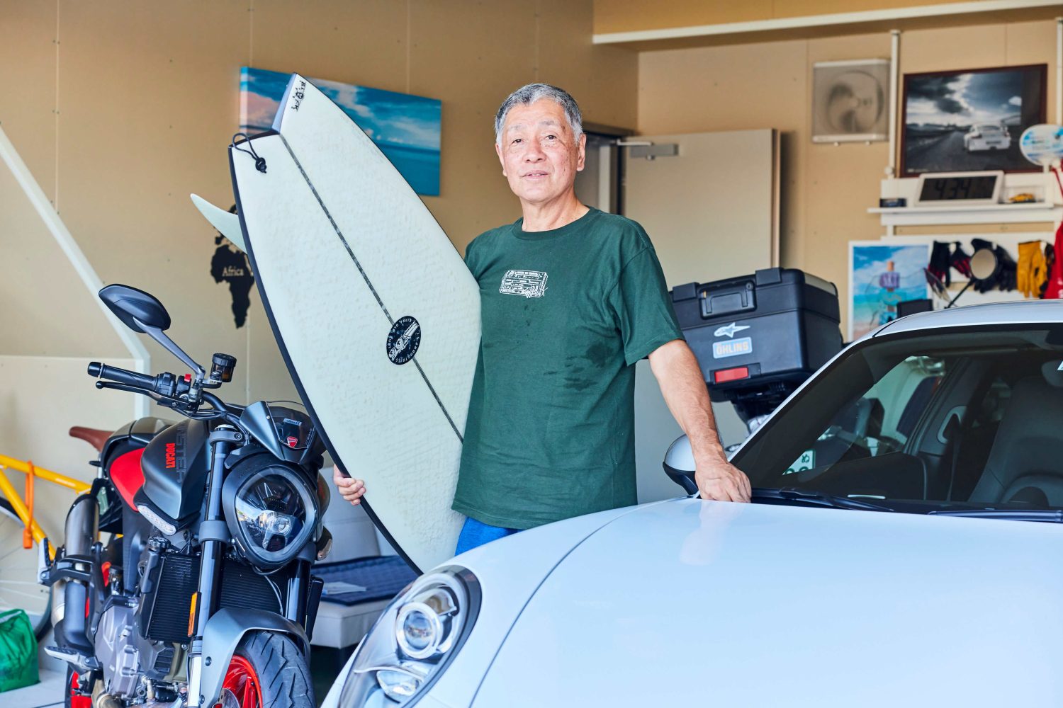 「車とバイク2台、サーフィンやスキーの道具、ソファベッドやテーブルを置いても余裕のガレージスペース。さらに、立地も海にも山にも出やすい物件だから、借りて大正解でした。プレミアムガレージハウスを借りたことで行動範囲が広がりましたし、妻も楽しんでくれているのは嬉しいですね」