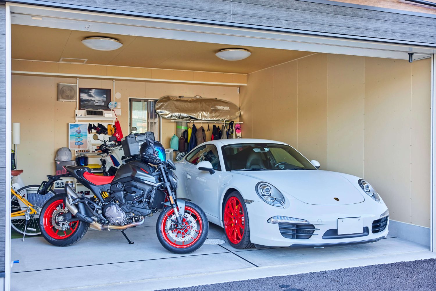 ガレージの開け放たれたシャッターから顔を覗かせるのは、白く輝くボディに真っ赤なホイールが映えるポルシェ911カレラ。そのとなりには、限定モデルのドゥカティ モンスターとBMW GS1200のバイクが堂々と並びます 。ガレージの奥には、ツーリングの衣装やサーフボード、スキー板が並び、オーナーのアクティブなライフスタイルが窺えます。