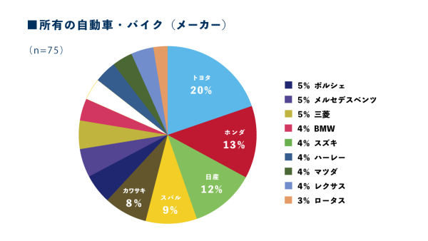 最後に、入居を検討している方が現在所有している車の種類について聞きました。1位は「オープン/クーペ」と、スポーツカーやラグジュアリーカーを所有されている方が多いようです。さらにSUV/4WD、大型二輪とつづき、ここまでが約半数を占める結果に。入居検討者の車へのこだわりが見える結果となりました。メーカーは、トヨタ、ホンダ、日産、スバルと国内産がつづき、次いでバイクメーカーのカワサキがランクイン。以降、ポルシェ、メルセデス・ベンツ等の外国車がつづきました。近年、車の盗難・車上荒らしも増加していることもあり、愛車をシャッター付きのガレージで保管できる賃貸ガレージハウスは、ますますニーズが高まっています。