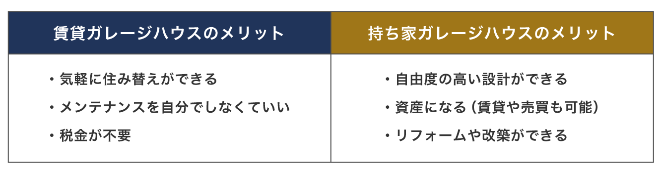 では、賃貸ガレージハウスと持ち家ガレージハウス、それぞれどのようなメリットがあるでしょうか?比較してみましょう。