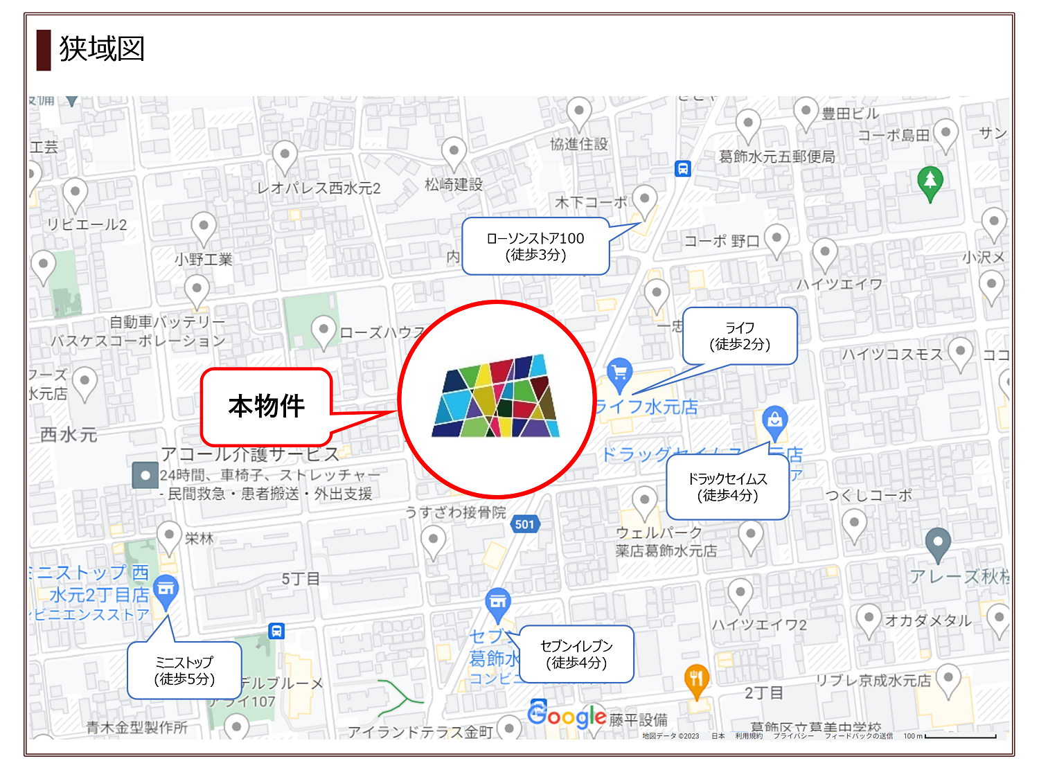 - 徒歩2分にスーパー、徒歩3分にコンビニがあり便利な住環境