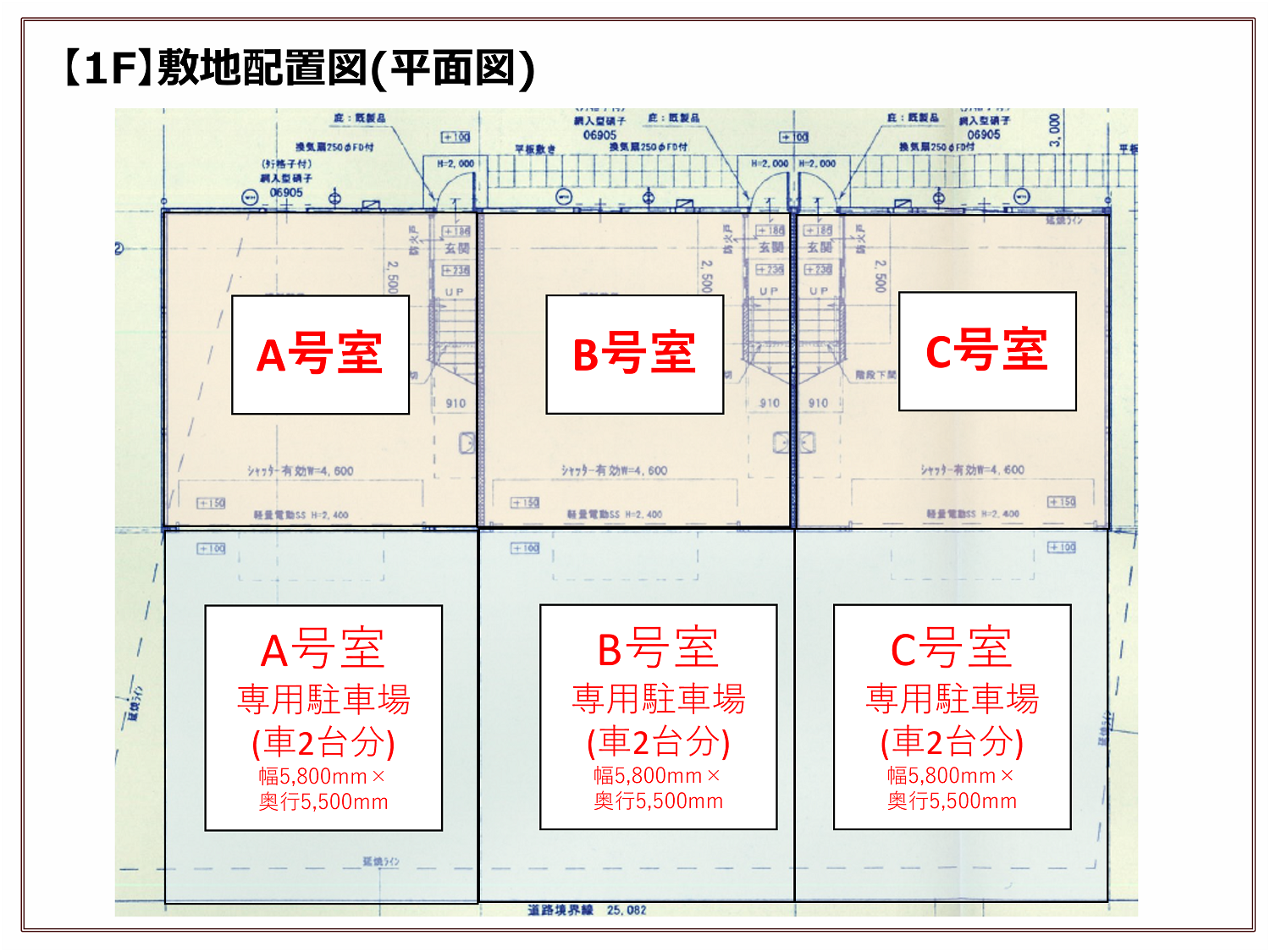 車2台分収容可能ガレージ+1Rの居住スペース+屋外専用駐車場(車2台分)