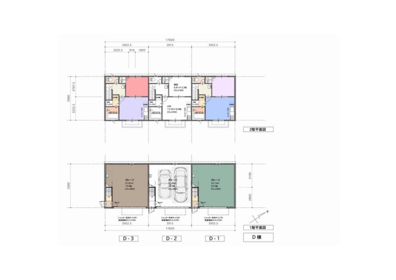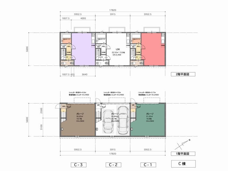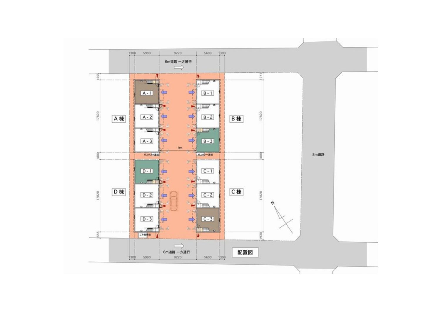 B棟・C棟:車2台分収容可能ガレージ+1Rの居住スペース+屋外専用一時駐車スペース(車1台分)】