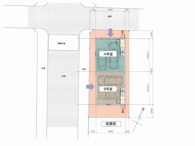 - 2台用ガレージ:幅約5.8m×奥行き約5.4m シャッター開口部:幅約4.6m×高さ約2.2m