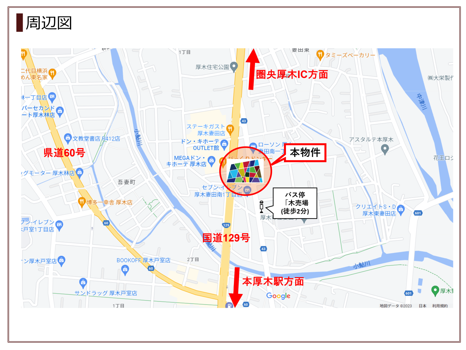 最寄りバス停「木売場」から「本厚木駅」まで、神奈川中央交通バス「本厚木駅行」「厚木バスセンター行」で6分~9分
