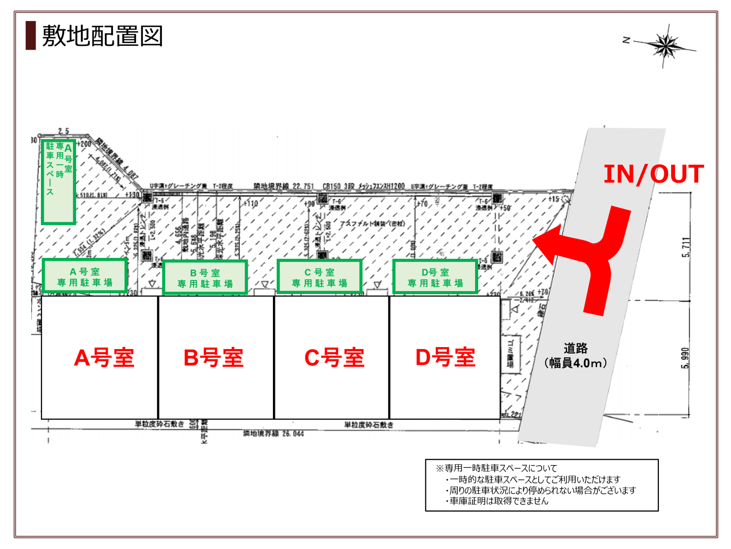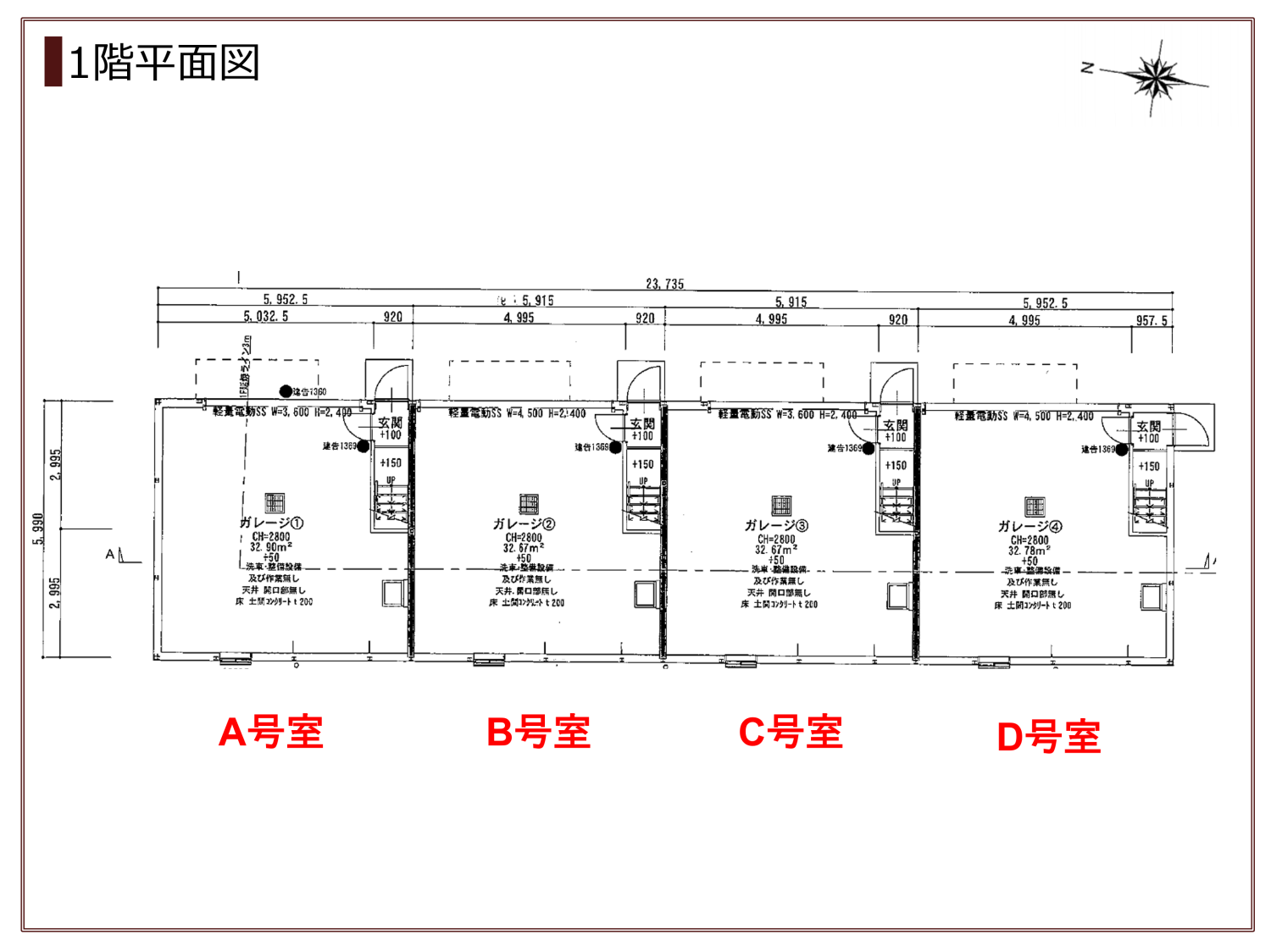 - A号室:ガレージ 幅芯々約5.0m×奥行芯々約5.9m