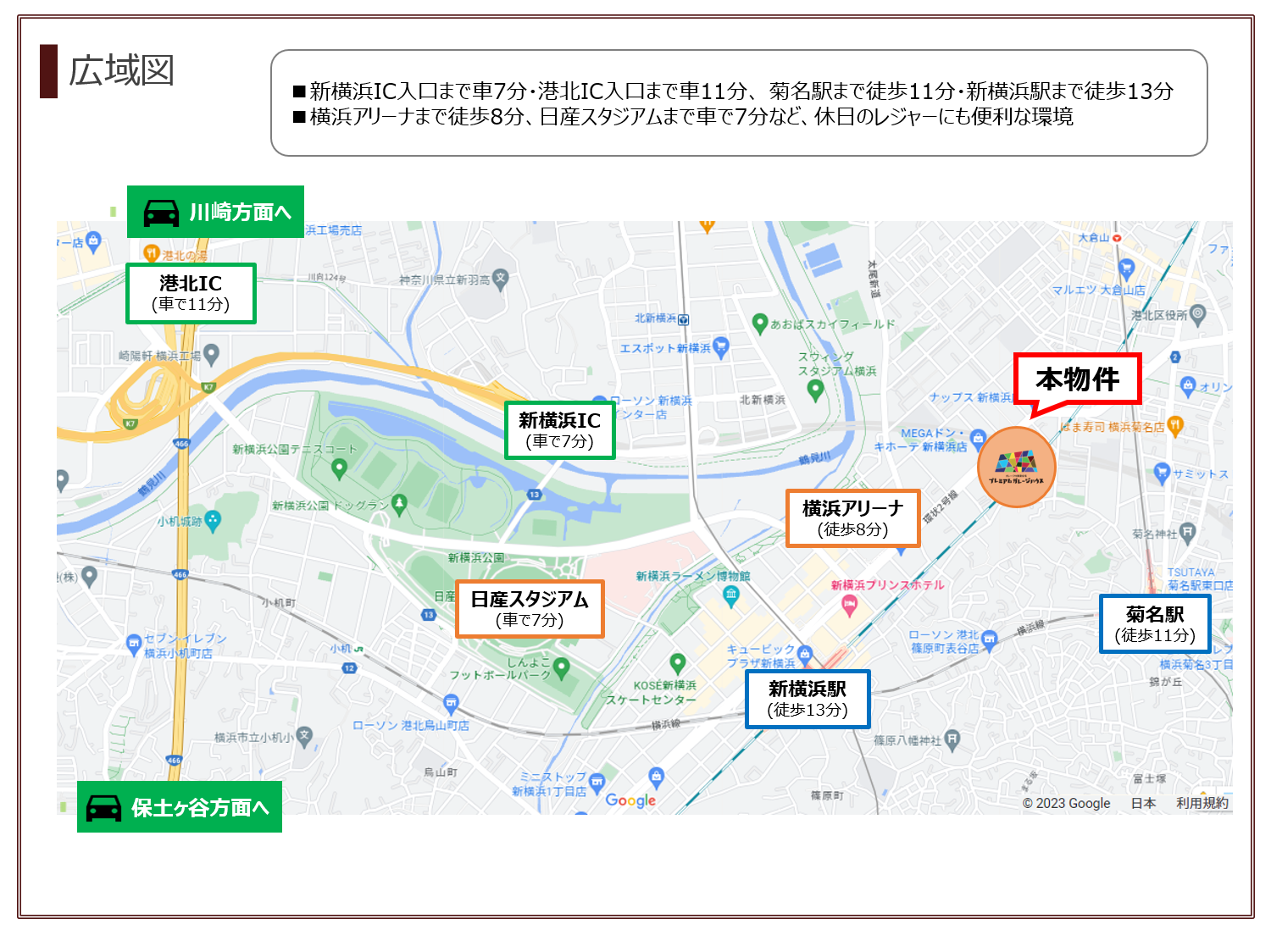 ・新横浜IC入口まで車で7分・港北IC入口まで車で11分、 菊名駅まで徒歩11分・新横浜駅まで徒歩13分