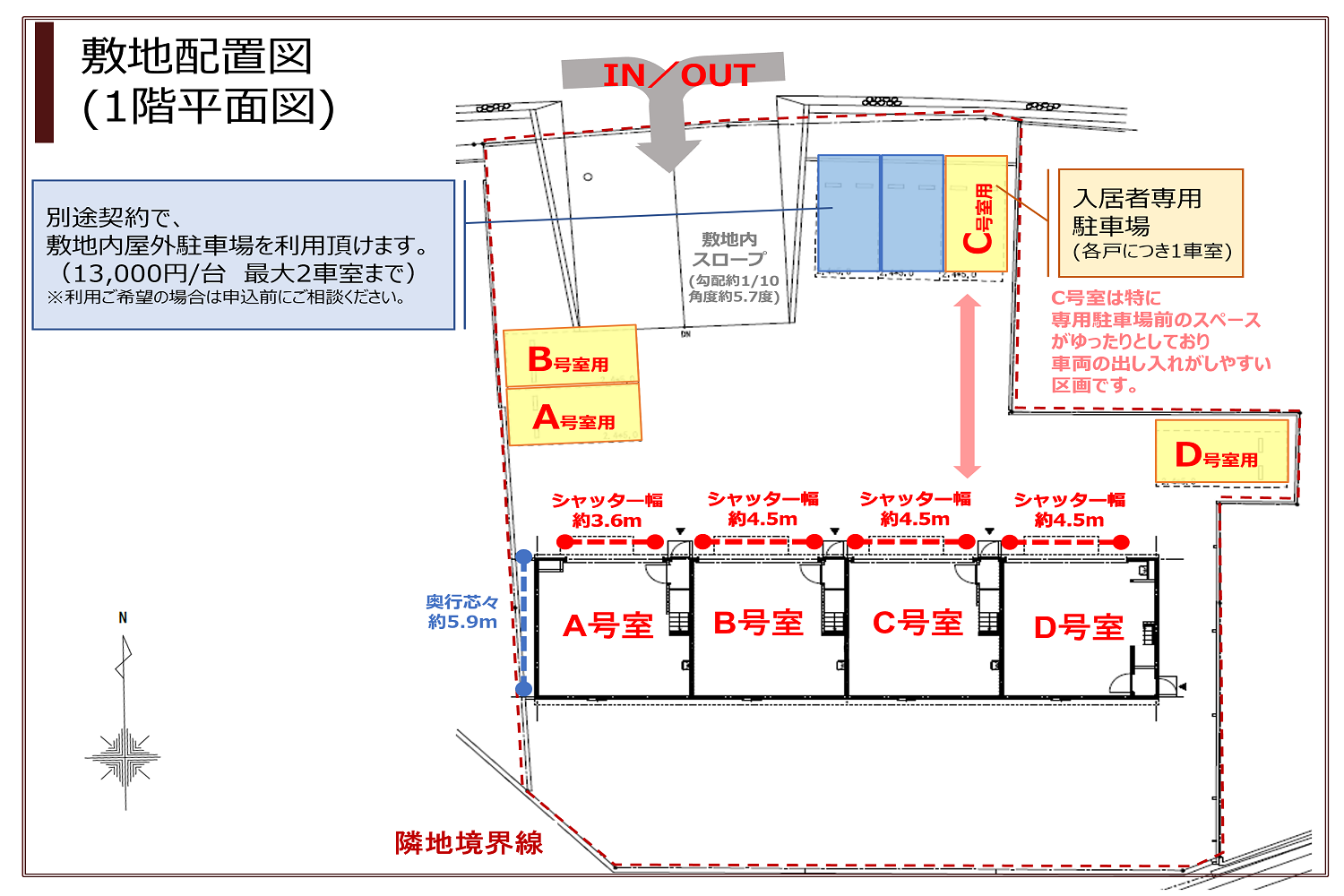 1LDK・1DK+車2台分収容可能ガレージ+屋外専用駐車場(1車室) ※別途契約可能な屋外駐車場 (先着順2車室まで)有 13,000円/台