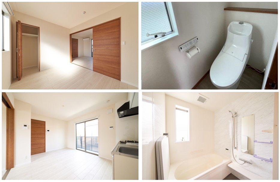 ユニットバス(追焚き機能付・1616サイズ)、洗面化粧台、トイレ(温水洗浄便座付)、システムキッチン(2口コンロ)