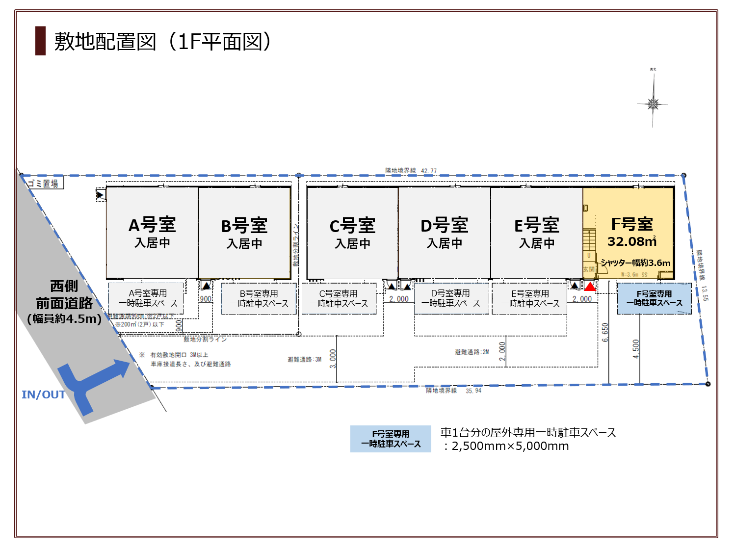 シャッター開口部 幅約4.5m×高さ約2.4m(D・E号室)