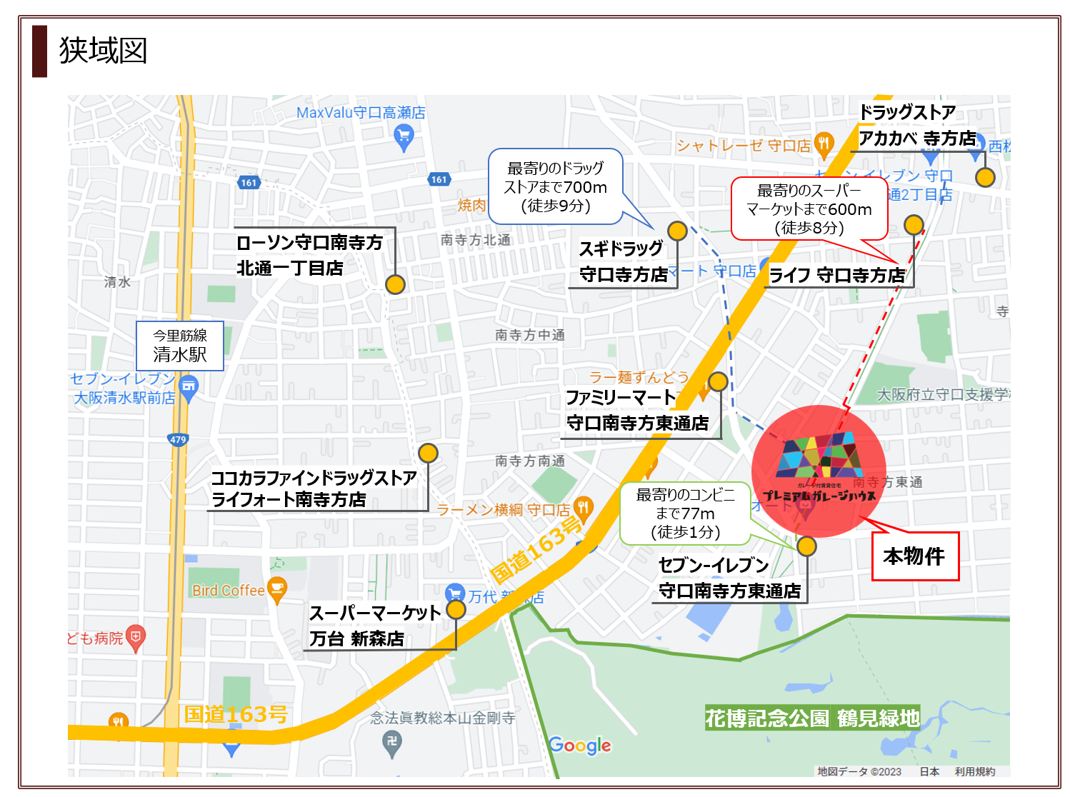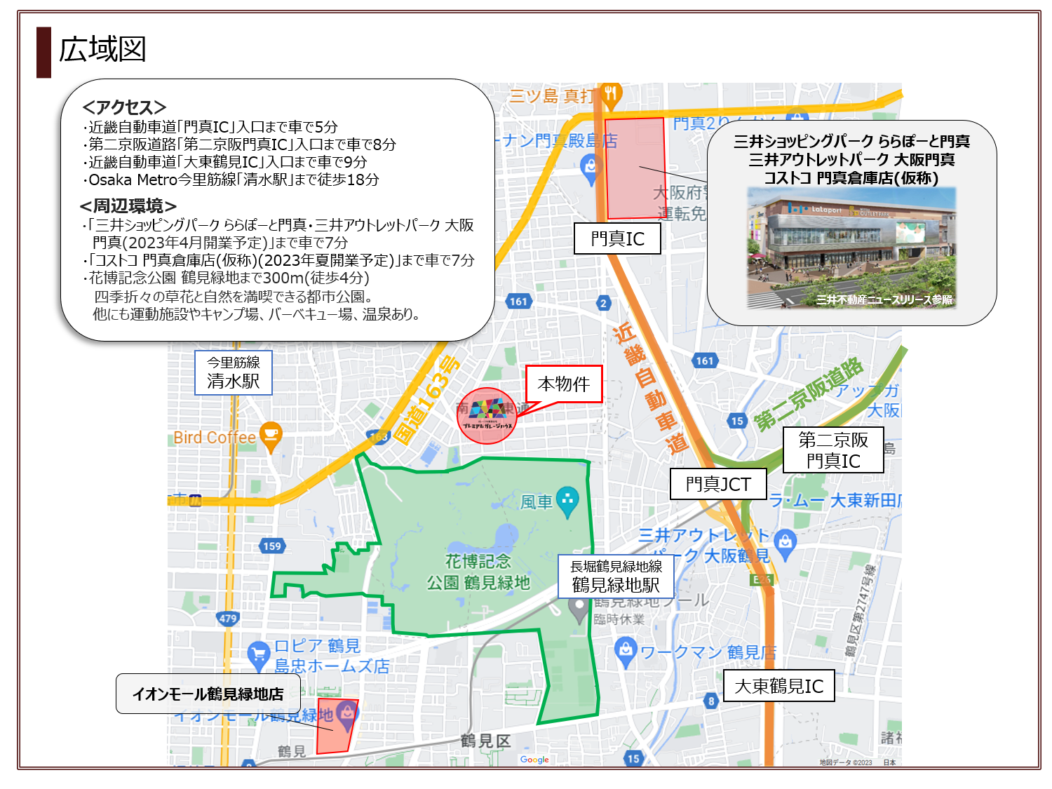 ・「三井ショッピングパーク ららぽーと門真・三井アウトレットパーク 大阪門真」「コストコ 門真倉庫店(仮称)(2023年夏開業予定)」まで車で7分