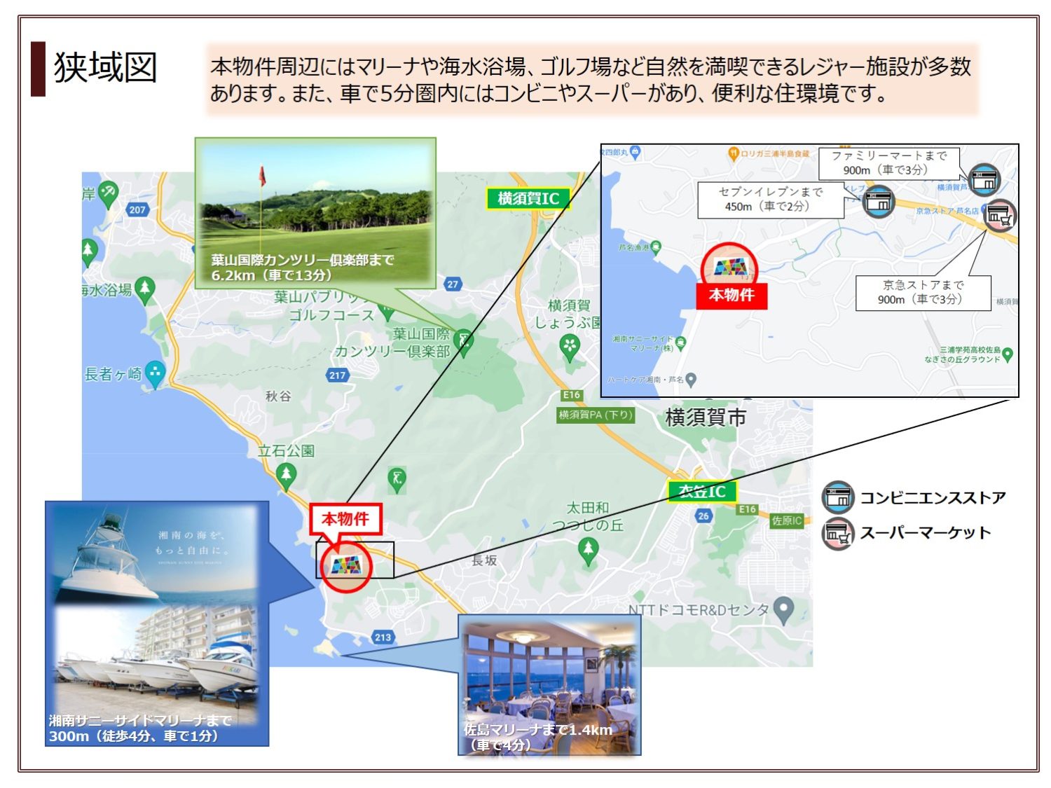 ・マリーナや逗子葉山エリアの海岸・海水浴場、ゴルフ場などのレジャー施設が周辺に多数
