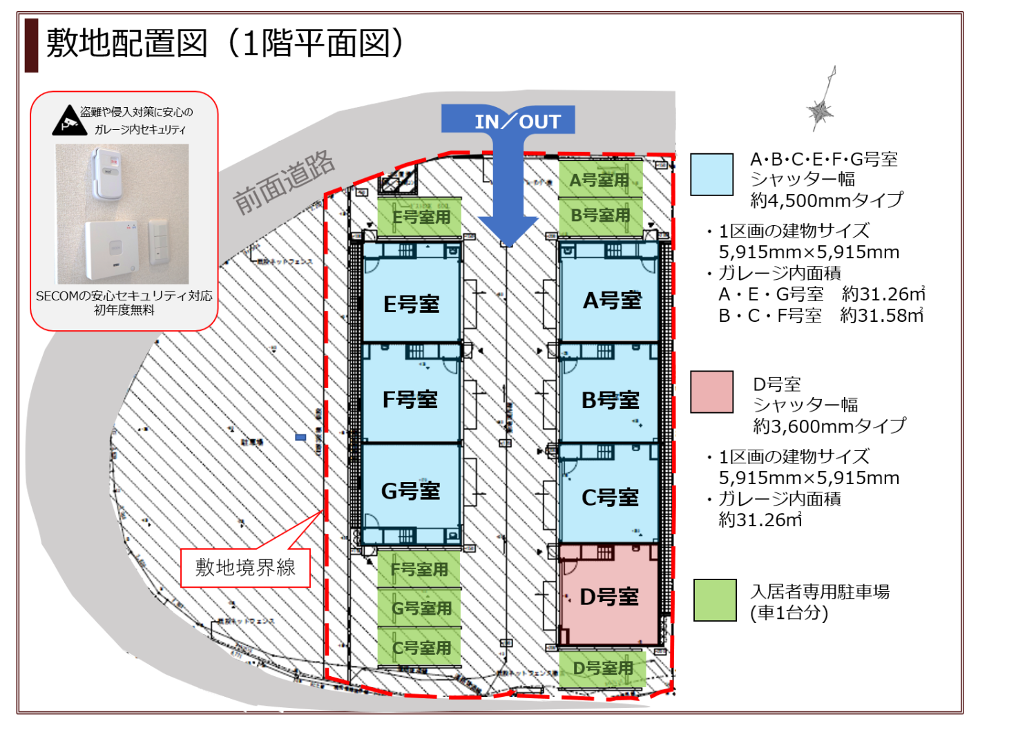 B・C・D・F号室 車2台分収納可能大型ガレージ+1LDK+屋外専用駐車場(車1台分)