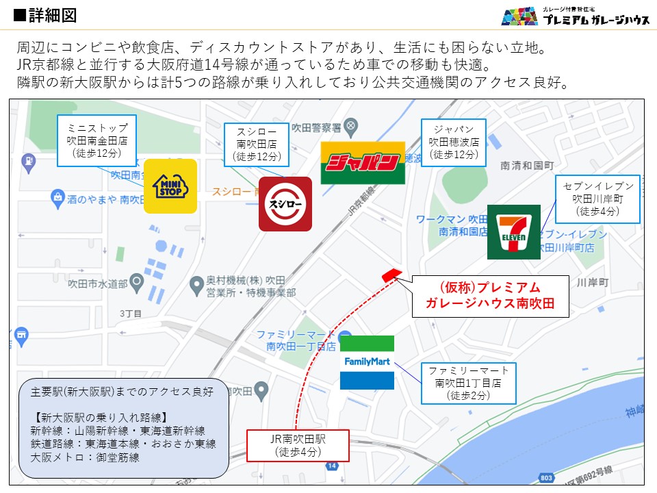 ・車、公共交通機関での大阪市内へのアクセスも良好。テレワークや週末ガレージライフに最適